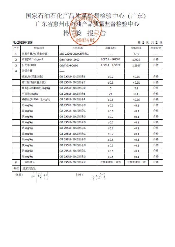 ? ? ? ? 2015年6月1日,我司的“馭藍柴油尾氣處理液”通過了第三方——國家石油石化產品質量監(jiān)督檢驗中心(廣東省惠州市石油產品質量監(jiān)督檢驗中心)的檢測,其中多個檢測項目包括:密度、折光度、堿度、縮二脲含量、醛類指標、不溶物含量、磷酸鹽含量,檢測出來的指標都遠遠低于國家規(guī)定標準,其他的重金屬鋁、鈣、鉀、鈉、銅、鐵、鎂、鎳、鋅、鉻都均未檢測出來,就連紅外定性也與標準譜圖一致,相關技術指標均符合國家GB 29518-2013《尿素水溶液》的嚴格標準,最后“馭藍”順利地拿到了合格的檢測報告。