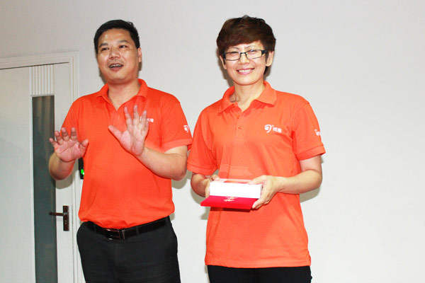 △總經(jīng)理助理李紹英為大客戶經(jīng)理張劍鋒頒發(fā)最佳進(jìn)步獎。