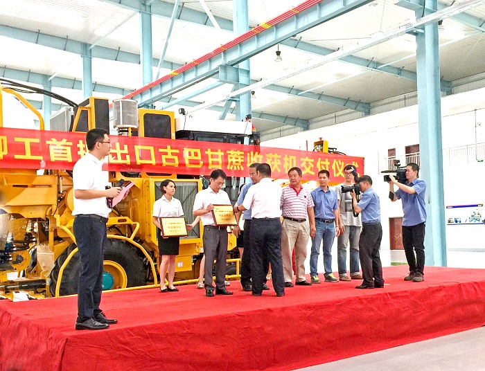 ? ? ? ? 2016年8月18日,廣西柳工農業機械股份有限公司首批出口古巴甘蔗收割機交付儀式在其廠區總裝車間舉行,柳工首批5臺甘蔗收獲機正式出口古巴。我司副總經理、總工程師吳憲,柳州工廠銷售部部長陳遠銘作為司能代表應邀參加了此次儀式。